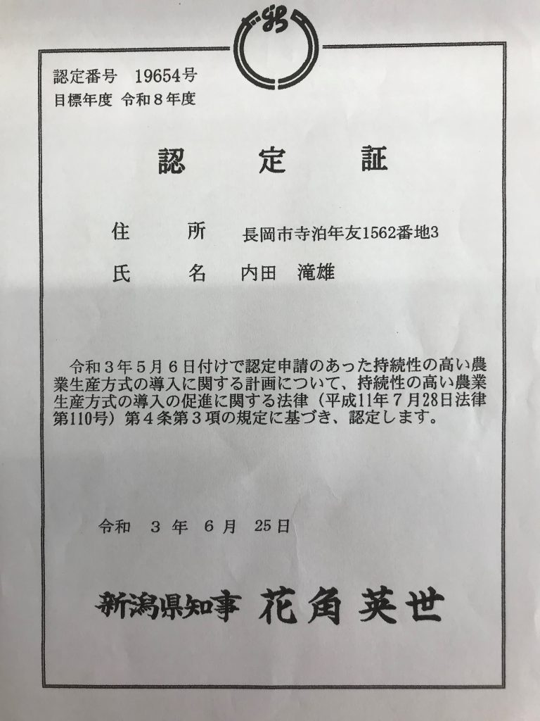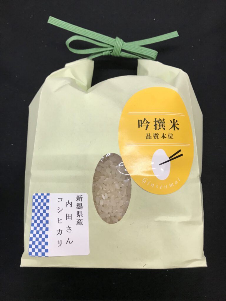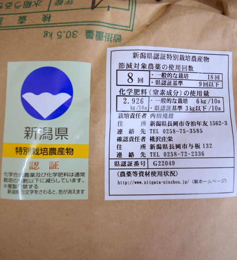 当店オリジナル契約栽培米。農薬を70%、化学肥料を60%減らし、有機肥料を使った安心、安全のおいしいお米です。内田農園のこしひかりは、新潟県知事より認定を受けた特別栽培米です。また、当生産者は、新潟県より環境保全型農業を実践する農業者として認定されている「エコファーマー」。